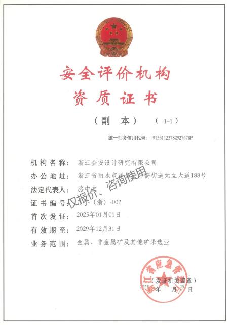 浙江金安设计研究有限公司成立于1993年12月,原名浙江省遂昌金矿设计研究所,2005年10月改制并更名为浙江金安矿业设计研究有限公司,2017年2月更名为浙江金安设计研究有限公司,注册资本315万元,2015年取得安评乙级资质(金属、非金属及其他矿采选业),2017年1月增项了危化行业,2019年12月底取得安评资质(金属非金属及其他矿采选业行业)。公司现有职工43人,其中专职安全评价师有25人,注册安全工程师12名。专业覆盖了安全工程、地质、采矿、测量、化工、矿山机械、矿井通风与安全、工业分析、水利水电工程、电气等专业。