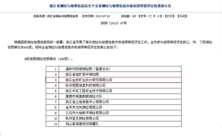 浙江省测绘与地理信息局关于全省测绘与地理信息市场信用等级评定结果的公告